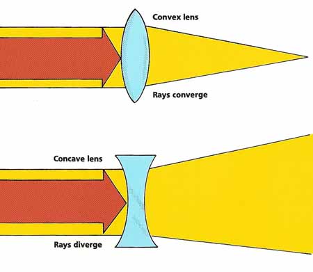 ويعتمد مسار الأشعة الفعلي عبر العدسة (إن كان لمًا أو تفريقًا) على شكلها، ونوعا العدسات الرئيسيان هما العدسات المحدبة والعدسات المقعرة، وتكون العدسات المحدبة اسمك في وسطها منها في أطرافها بينما تكون العدسات المقعرة اسمك في أطرافها منها في وسطها.